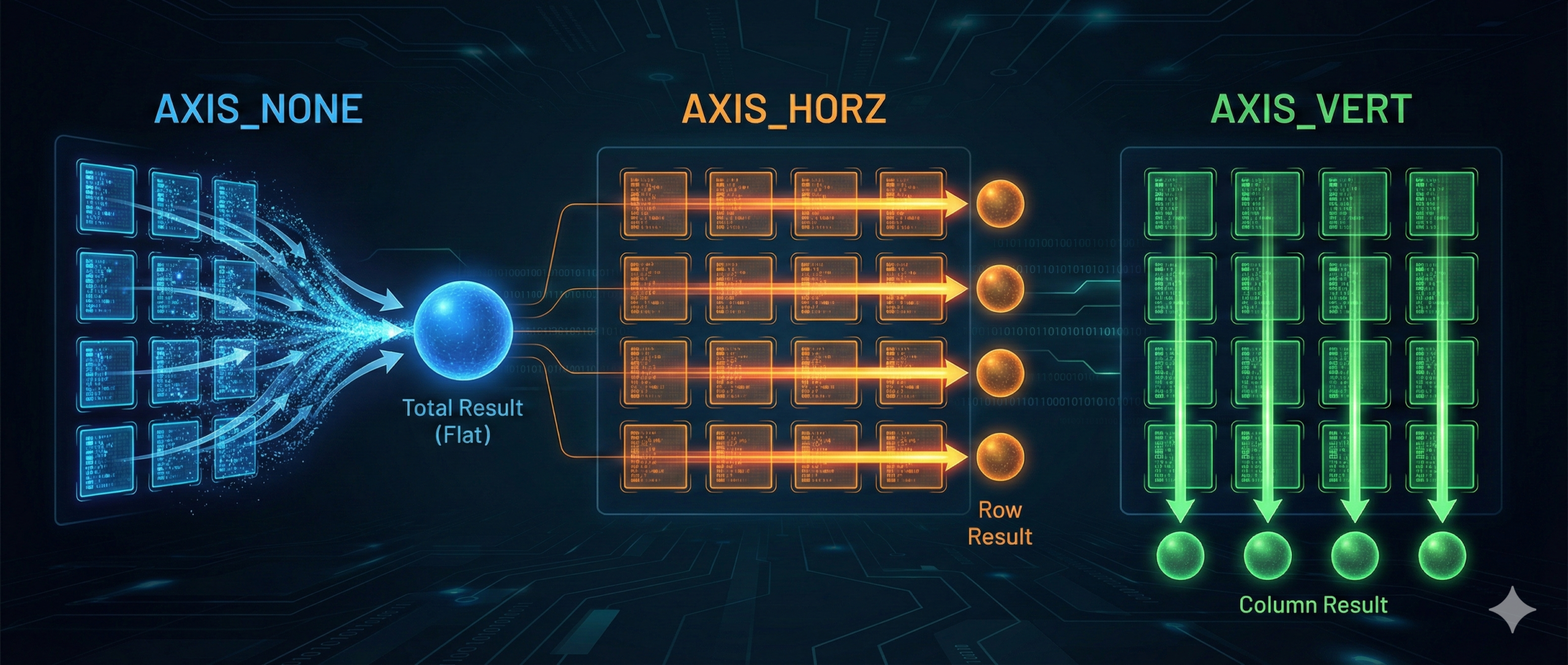 AXIS_NONEは、軸を指定しない指定です。この指定のときは、計算が行列の全要素に対して行われ、行列をベクトルのように扱って処理されます。公式リファレンスでは、Flatメソッドを使って1次元として扱うイメージに近いことが示されています。