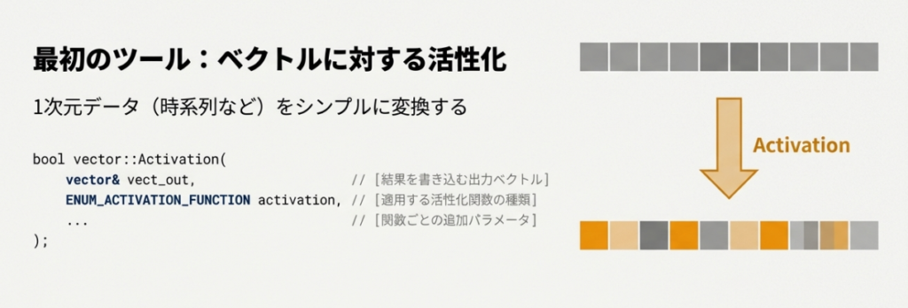 Activation関数には、ベクトル用と行列用の二種類のメソッドがあります。ベクトル用はベクトル型に対するメンバメソッド、行列用は行列型に対するメンバメソッドとして用意されています。行列版には、どの軸(行方向か列方向か)で処理するかを指定するためのaxis引数を持つオーバーロード(同名で引数構成が異なる関数)もあります。