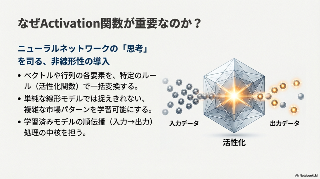 Activation関数は、ニューラルネットワーク(入力データから出力を学習する数値モデル)の中で、各層の出力を変換する役割を持つメソッドです。EA(自動売買プログラム)での使い方を考えるときは、行列やベクトルによる計算と組み合わせて、売買判断のロジック全体の一部として活用する形がイメージしやすくなります。